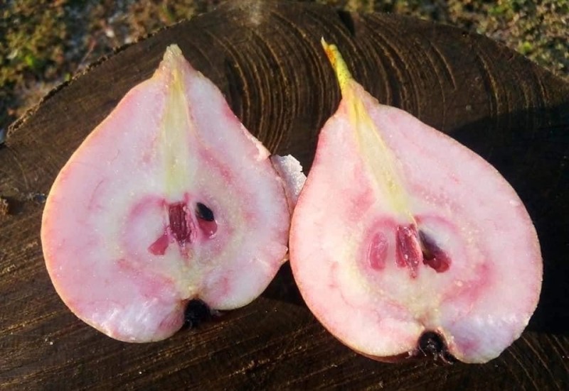 Os frutos desta pereira são médios a grandes, com uma casca que varia entre verde-amarelada e tons avermelhados, especialmente na parte exposta ao sol. A polpa tem um sabor doce e levemente ácido, sendo muito suculenta. A sua característica mais marcante é a polpa de coloração avermelhada, que dá um visual vibrante e único.